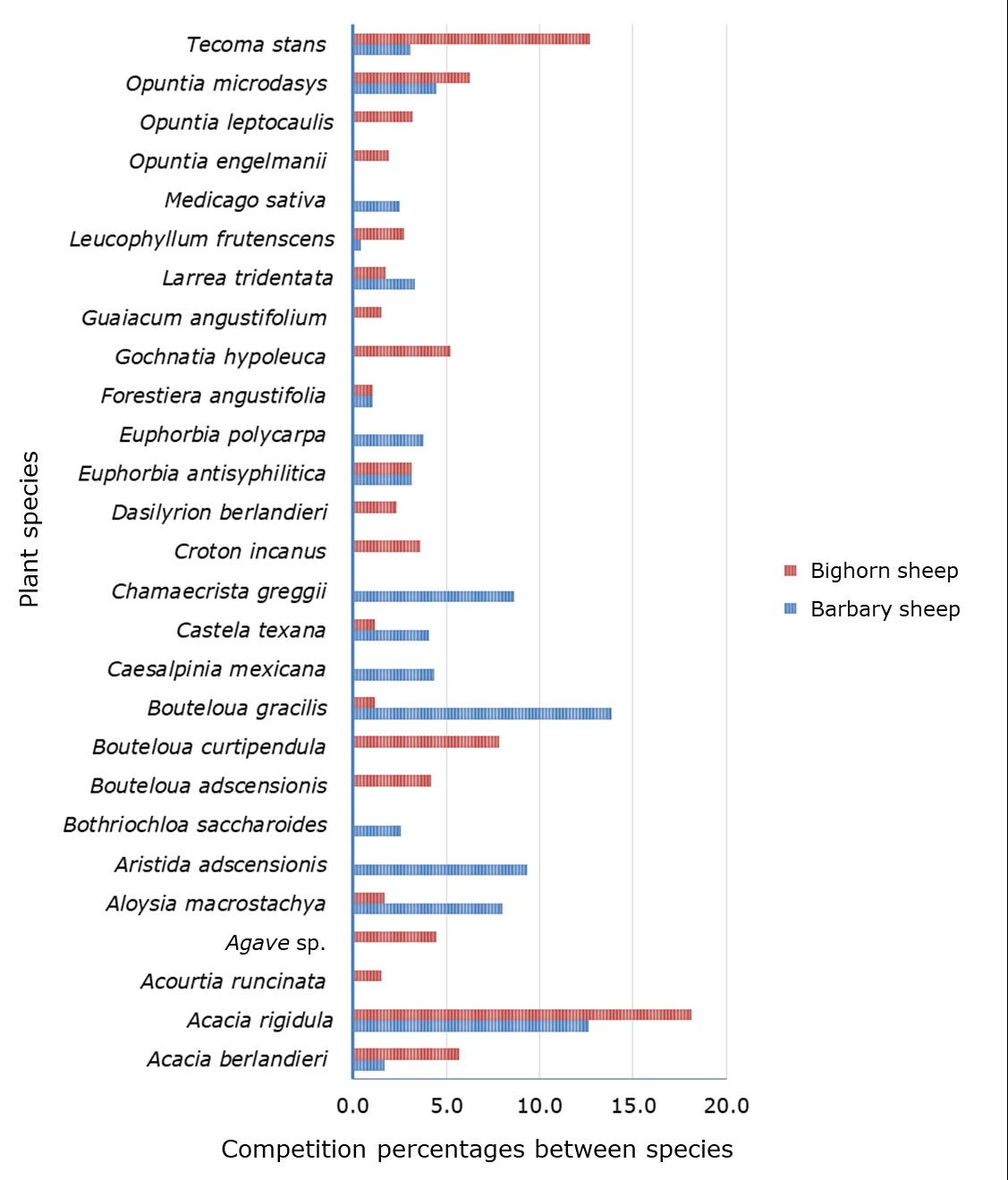 The two sheep species show a preference for shrub and tree species, but their degree of competition is not high enough to affect one species to the other; the degree of selection and the plants chosen for consumption are not determined by the plants themselves, however, competition occurs only when both sheep have the same resources, and these are limited or reduced within their habitat.