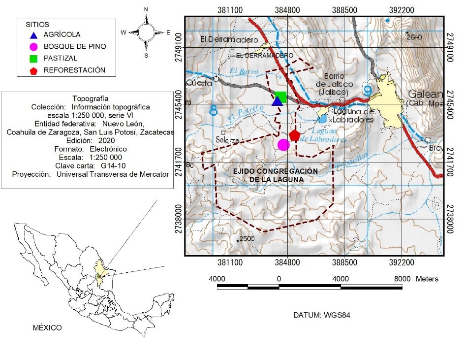 El área de estudio se ubicó en el ejido Congregación de la Laguna, municipio Galena, Nuevo León, México, cuyas coordenadas son 24°49′59.88″ N y 100°04′01″ O. El clima dominante es templado subhúmedo con lluvias de verano, la precipitación total anual fluctúa entre 600 y 800 mm, y la temperatura media anual entre 12 y 18 °C (INEGI, 2008). Los suelos dominantes en la zona pertenecen al tipo Leptosol (38.8 %) y Regosol (20 %) calcáreo. La vegetación en los valles y partes bajas es un matorral desértico rosetófilo y en las partes más altas los pinos cubren áreas considerables (INEGI, 2007).