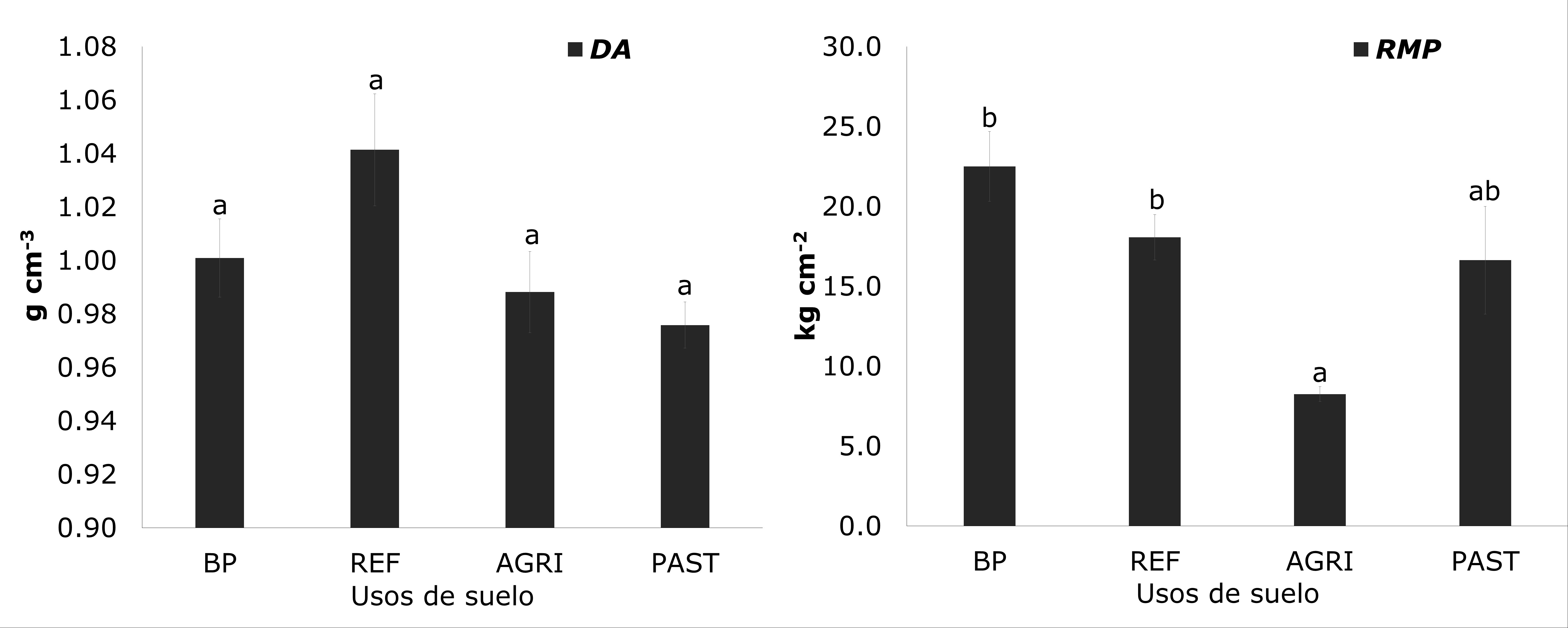 Cabe destacar que entre los cuatro usos de suelo: reforestación con bordos, pastizal abandonado, áreas agrícolas y el bosque de pino, no presentaron diferencias significativas en las propiedades físicas y químicas evaluadas, con excepción de la RMP. En el Cuadro 2 se resumen los resultados del análisis de varianza de dos vías: el uso de suelo (Factor A) únicamente tuvo diferencias significativas para la resistencia mecánica a la penetración de la capa superficial, en la que el cambio de uso de suelo afectó principalmente el sistema poroso, el cual está correlacionado con la infiltración del agua, el crecimiento de las raíces y la productividad de los cultivos (Cerana et al., 2005).