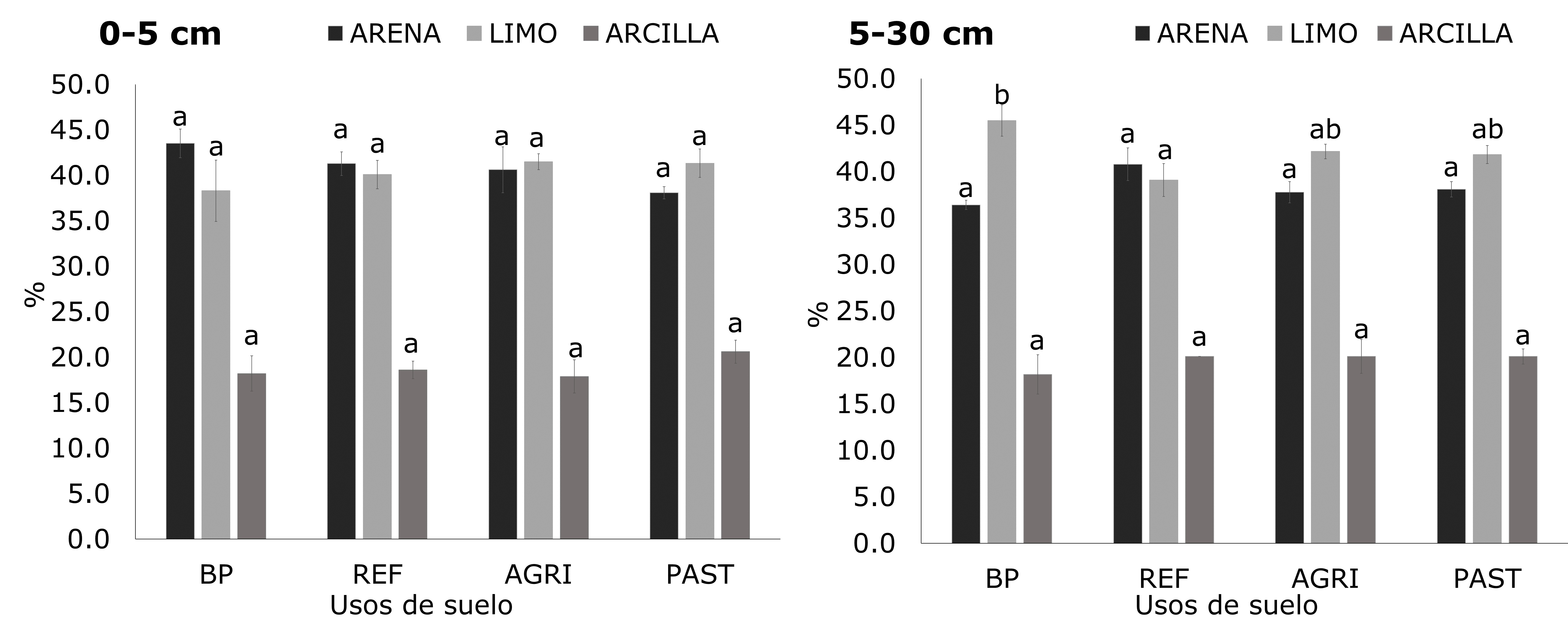 Figura 3. Gráficos de valores medios de textura (arena, limo y arcilla) para las dos profundidades (0-5 y 5-30 cm).