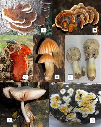 Especies frecuentes: A = Ganoderma lobatum (Cooke) G. F. Atk.; B = Trametes versicolor (L.) Lloyd; C = Lysurus periphragmoides (Klotzsch ex Hook.) Dring; D = Heliocybe sulcata (Berk.) Redhead & Ginns. Especies poco frecuentes: E = Agaricus deserticola G. Moreno, Esqueda & Lizárraga; F = Pluteus petasatus (Fr.) Gillet; G = Phellodon fibulatus K. A. Harrison.