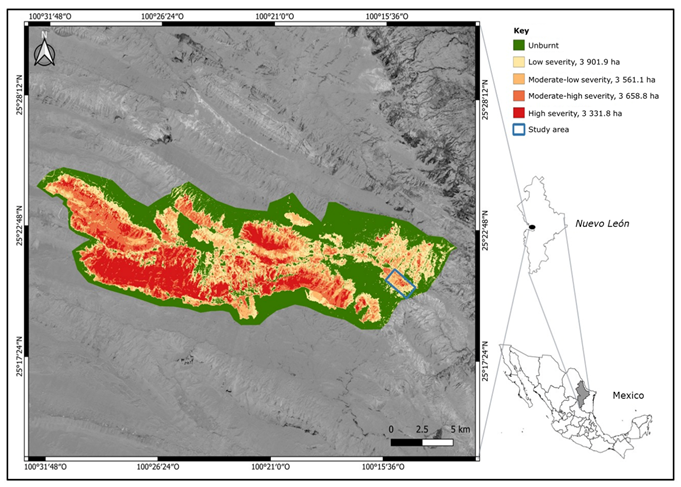 The study was carried out in a fraction of the Eastern Sierra Madre, in the Cumbres de Monterrey National Park (CMNP), specifically in the community of El Tejocote (25°20'38.2" N, 100°14'53.0" W), located west of Santiago municipality, Nuevo León State. The area is located at an altitude between 2 000 and 2 300 m, with a vegetation consisting mainly of pine-oak forest, where the presence of the following species stands out Pinus teocote Schltdl. & Cham., P. pseudostrobus Lindl., P. greggii Engelm. ex Parl., Quercus canbyi Trel., Q. laceyi Small and Q. polymorpha Schltdl. & Cham. The mean annual temperature is 14.1 °C, the maximum values range from 16.8 to 29.8 °C, and the minimum values from 0.8 to 9.4 °C, and the annual precipitation is 766.5 mm, with a maximum of 89.6 mm and a minimum of 13.5 mm (Cuervo-Robayo et al., 2015a; Cuervo-Robayo et al., 2015b). A fire occurred in the CMNP in March 2021 that affected 14 453.60 ha of land (Figure 1).