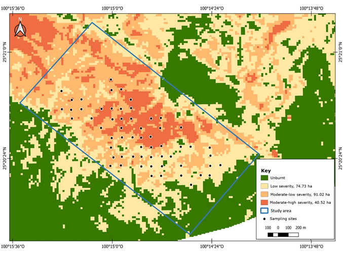 The fire severity variable was determined by the dNBR (differenced Normalized Burn Ratio) index, using the difference between the pre-fire NBR (Normalized Burn Ratio) and the post-fire NBR: dNBR=pre-fire NBR-post-fire NBR (Valdez-Zavala et al., 2019), in addition to a field record of fire evidence made for the purpose of correct interpretation (Keeley, 2009).