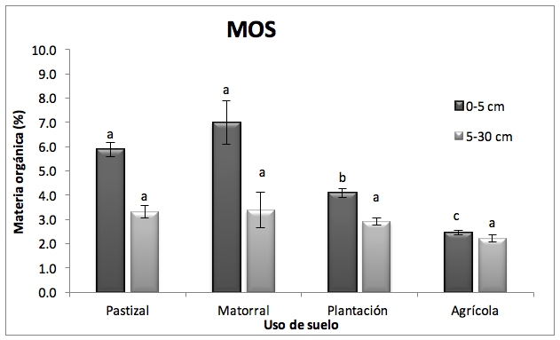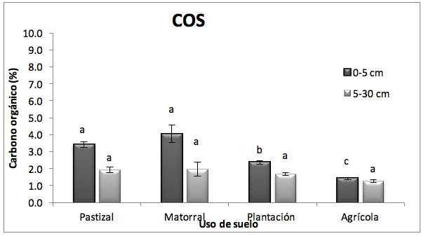 La MOS y COS no registran diferencias en la profundidad 5-30 cm en los distintos usos del suelo. El contenido de MOS y Nt para los diferentes usos del suelo en ambas profundidades tiene el siguiente orden: Matorral > Pastizal > Plantación > Agrícola.