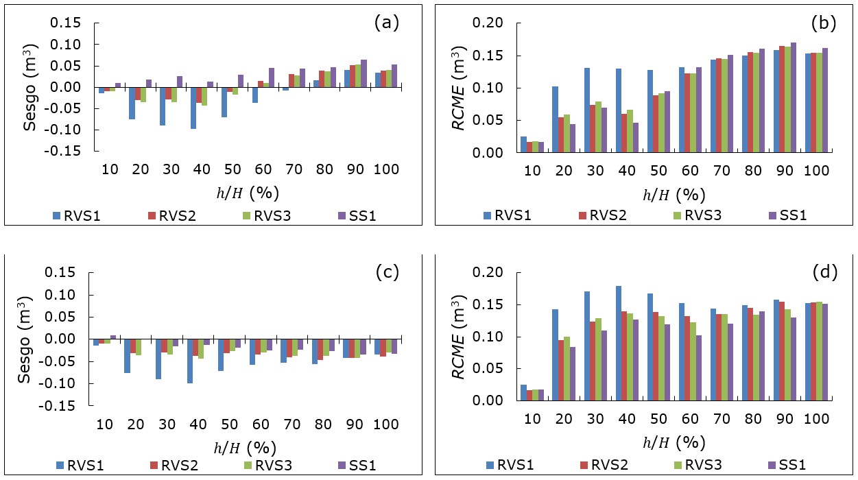 La Figura 2a muestra el comportamiento del error en volumen, respecto a la altura relativa en el ajuste de los cuatro sistemas de ecuaciones. En Pinus cooperi se observó que el error promedio cometido con los RVS1-RVS3 tuvo el mismo comportamiento; es decir, sobrestimaron el volumen fustal, en contraste al SS1 que subestimó el volumen comercial (Figura 2a). La evolución del valor de la RCME a lo largo de la altura relativa del fuste confirmó que el RVS2 y SS1 predijeron satisfactoriamente el volumen comercial, con valores menores a 0.2 m3 (Figura 2b). Respecto a la especie Pinus durangensis, los sistemas RVS1-RVS3 también sobrestimaron el volumen del fuste en función de su altura, en tanto que el SS1 solo presentó este comportamiento a partir de 30 % de la altura (Figura 2c). El comportamiento del valor de la RCME confirmó, nuevamente, que los RVS2 y SS1 predijeron satisfactoriamente el volumen del fuste con errores menores de 0.15 m3 (Figura 2d).