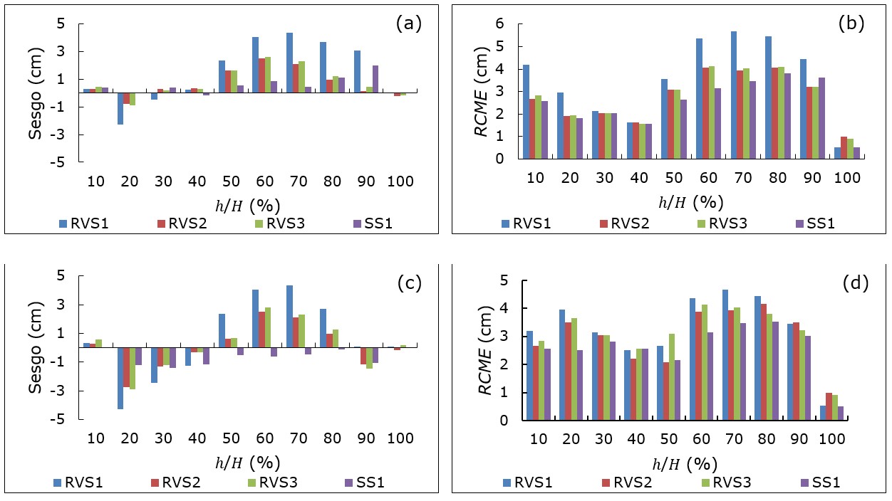 En la Figura 3 se presenta la evolución del valor del sesgo medio y RCME por altura relativa () para describir el ahusamiento de Pinus cooperi (figuras 3a y 3b). Los sistemas RVS1-RVS3 subestimaron el diámetro respecto a la altura del fuste con una excepción a partir de 30 % de la altura. El RVS1 registró valores hasta de 5 cm en alturas relativas mayores a 80 %, y los valores menores fueron inferiores a 2 cm (Figura 3a). Los valores de la RCME en los sistemas RVS2-RVS3 confirmaron una mayor precisión (valores menores a 4 cm) y una precisión baja se obtuvo en alturas del fuste mayores a 40 % de la altura total (Figura 3b).