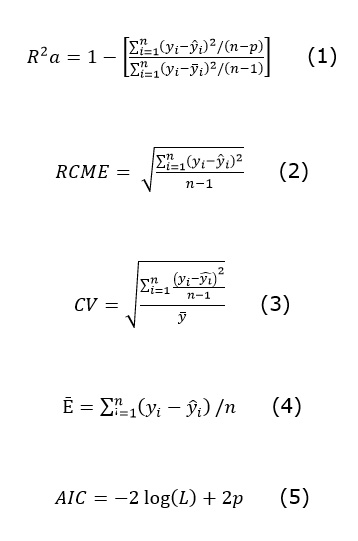 , 4), y criterio de información de Akaike (AIC, 5). Estos estadísticos se han utilizado en la evaluación de modelos de ahusamiento y volumen comercial (Quiñonez-Barraza et al., 2019; Zhao et al., 2019).