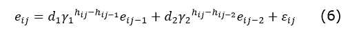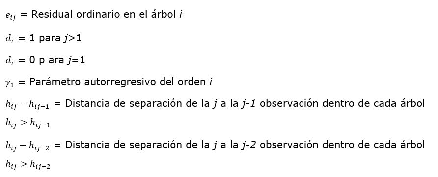 La autocorrelación en el componente de ahusamiento se corrigió con una estructura de error autorregresiva continua de segundo orden (CAR2), la cual consideró la distancia entre las mediciones de la altura comercial en cada árbol (Zimmerman y Núñez-Antón, 2001), ya que estas estructuras se han probado como funcionales en las ecuaciones de ahusamiento y volumen comercial (Corral-Rivas et al., 2017; García-Espinoza et al., 2018; Castillo-López et al., 2021). La estructura de autocorrelación no se incluyó en la ecuación de volumen comercial, dado que no representa ganancia en el ajuste de la ecuación (Quiñonez-Barraza et al., 2019; Zhao et al., 2019).
