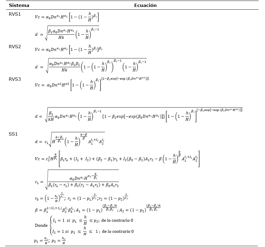 Para este estudio se ajustaron tres sistemas de ecuaciones de razón de volúmenes para el ahusamiento (Lynch et al., 2017) basados en las ecuaciones de razón de volúmenes citadas por Zhao y Kane (2017) (RVS1-RVS3), además del sistema segmentado ahusamiento-volumen (SS1) desarrollado por Fang et al. (2000) (Cuadro 1). La comparación se realizó con el precepto de que un sistema de ecuaciones basado en expresiones de razón de volúmenes es más simple y práctico que un modelo segmentado.