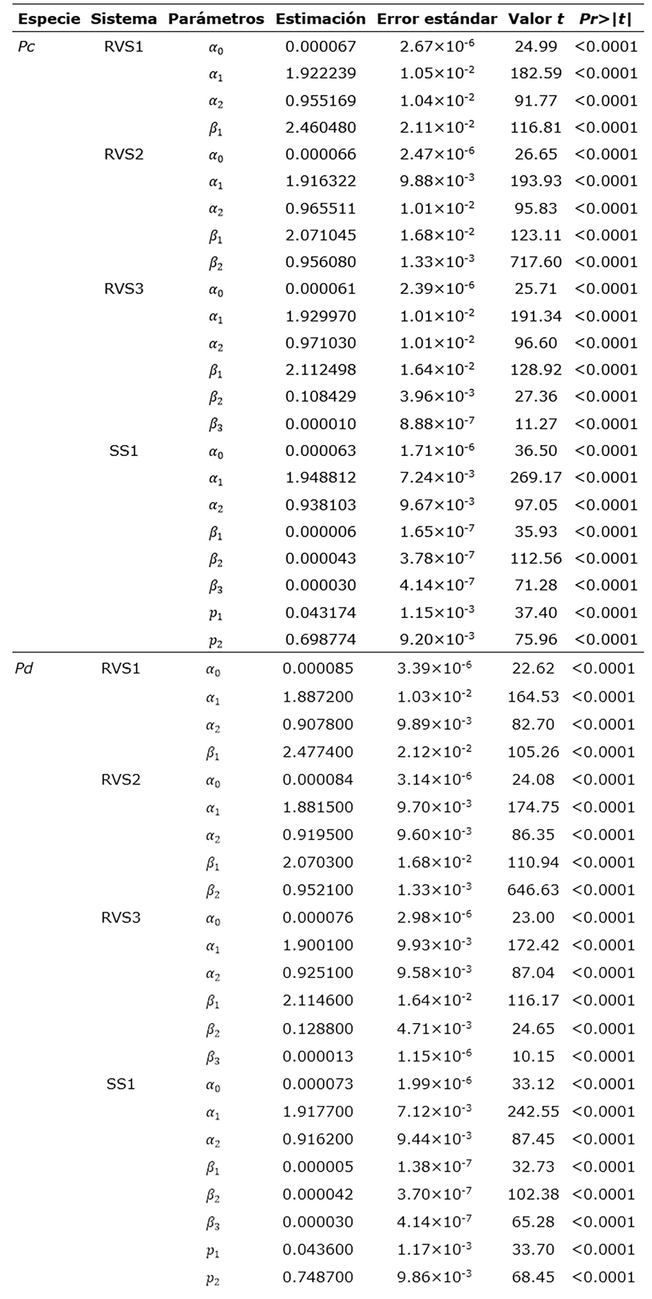 La estimación de los parámetros se realizó con regresión iterativa aparentemente no relacionada (ITSUR), con el procedimiento MODEL del paquete estadístico SAS/ETS® 9.4 (Statistical Analysis System, 2021). Fang et al. (2000) indican que el ajuste con ITSUR homogeniza y minimiza el error estándar de los parámetros en el sistema, además permite la compatibilidad del sistema. Para evitar problemas en la estimación de los parámetros, especialmente si es decir, cuando , se aplicó junto con una variable indicadora en la punta para evitar que se estimaran en cero las derivadas parciales de los parámetros.