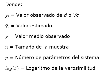 La evaluación cuantitativa de los sistemas analizados, tanto en el ajuste (70 % de la base de datos) como en la validación (30 % de la base de datos) fue a través del coeficiente de determinación ajustado (, 1), raíz del cuadrado medio del error (RCME, 2), coeficiente de variación (CV, 3), sesgo promedio (