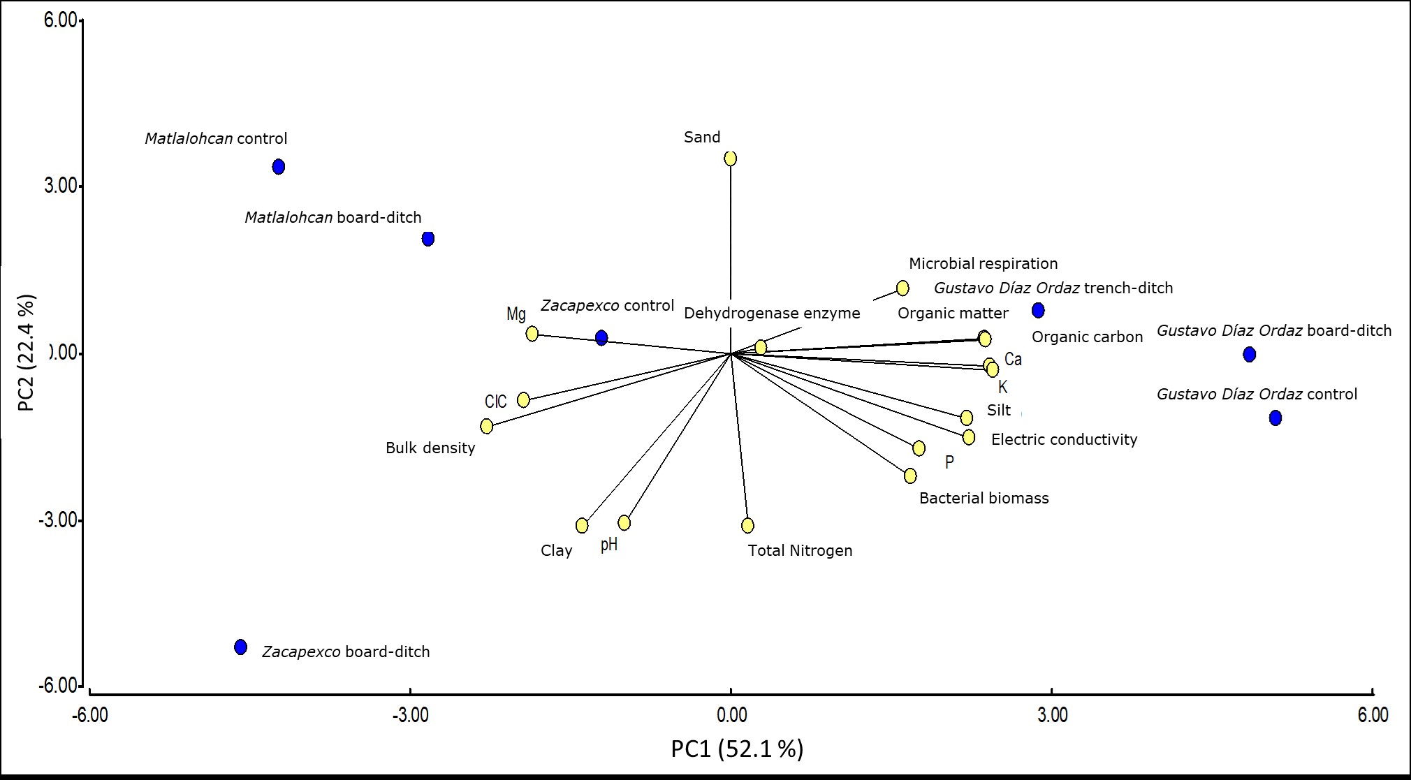 Figure 1. Biplot graph of soil properties in three sites in the state of Tlaxcala.