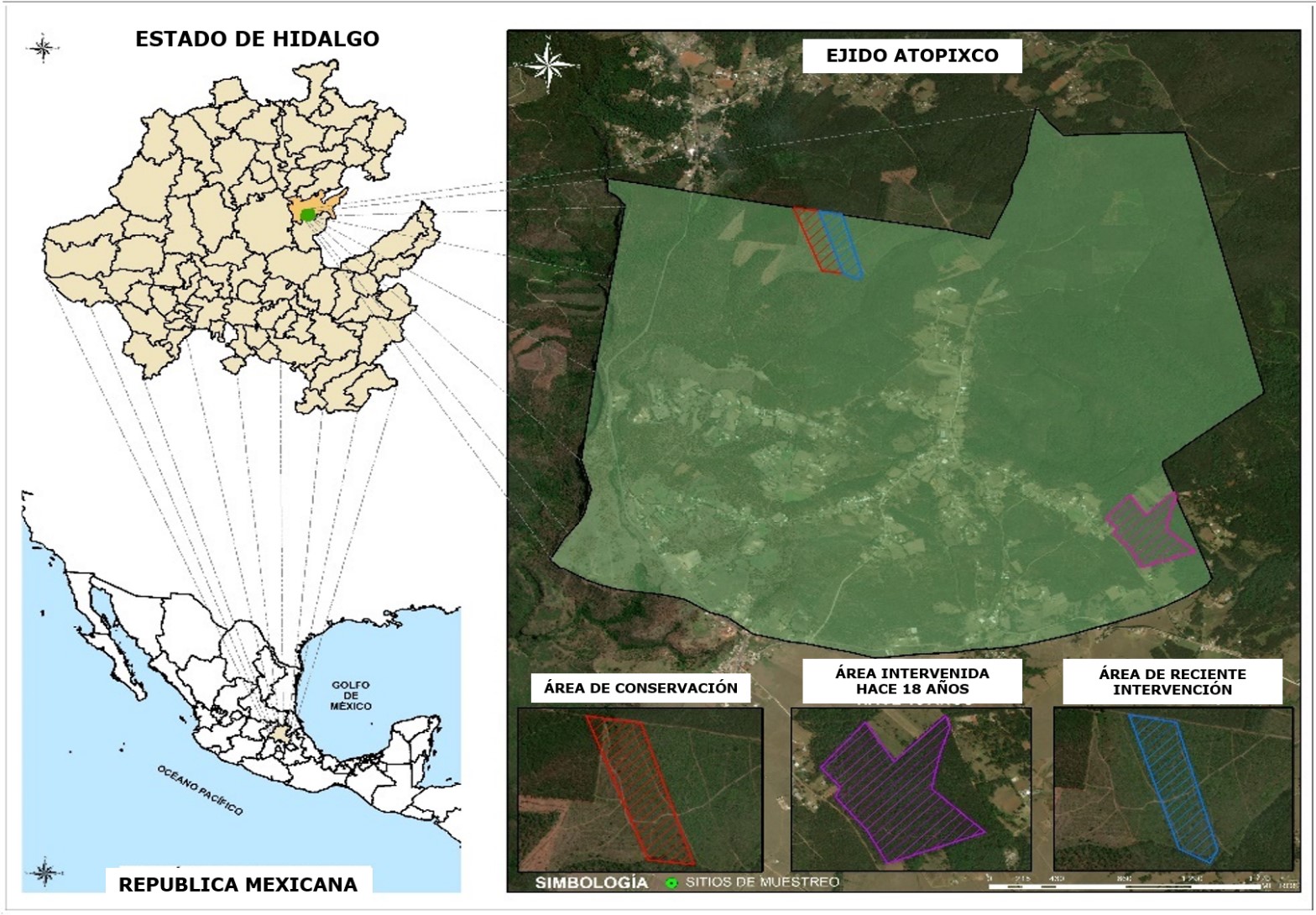Área de reciente intervención. Corresponde a la última área de aprovechamiento (año 2016), donde se eliminó el total de la vegetación a excepción de 16 árboles ha-1 a partir de la aplicación del método de árboles padre. Lo anterior provocó impactos sobre algunas características del suelo como la compactación por el derribo del arbolado, arrastre de trocerías y movimiento de camiones madereros, así como la modificación de materia orgánica por el control de desperdicios del aprovechamiento que, tradicionalmente, se realiza en la zona mediante quemas puntuales con poco riesgo de generar un incendio forestal (Cuadro 1).