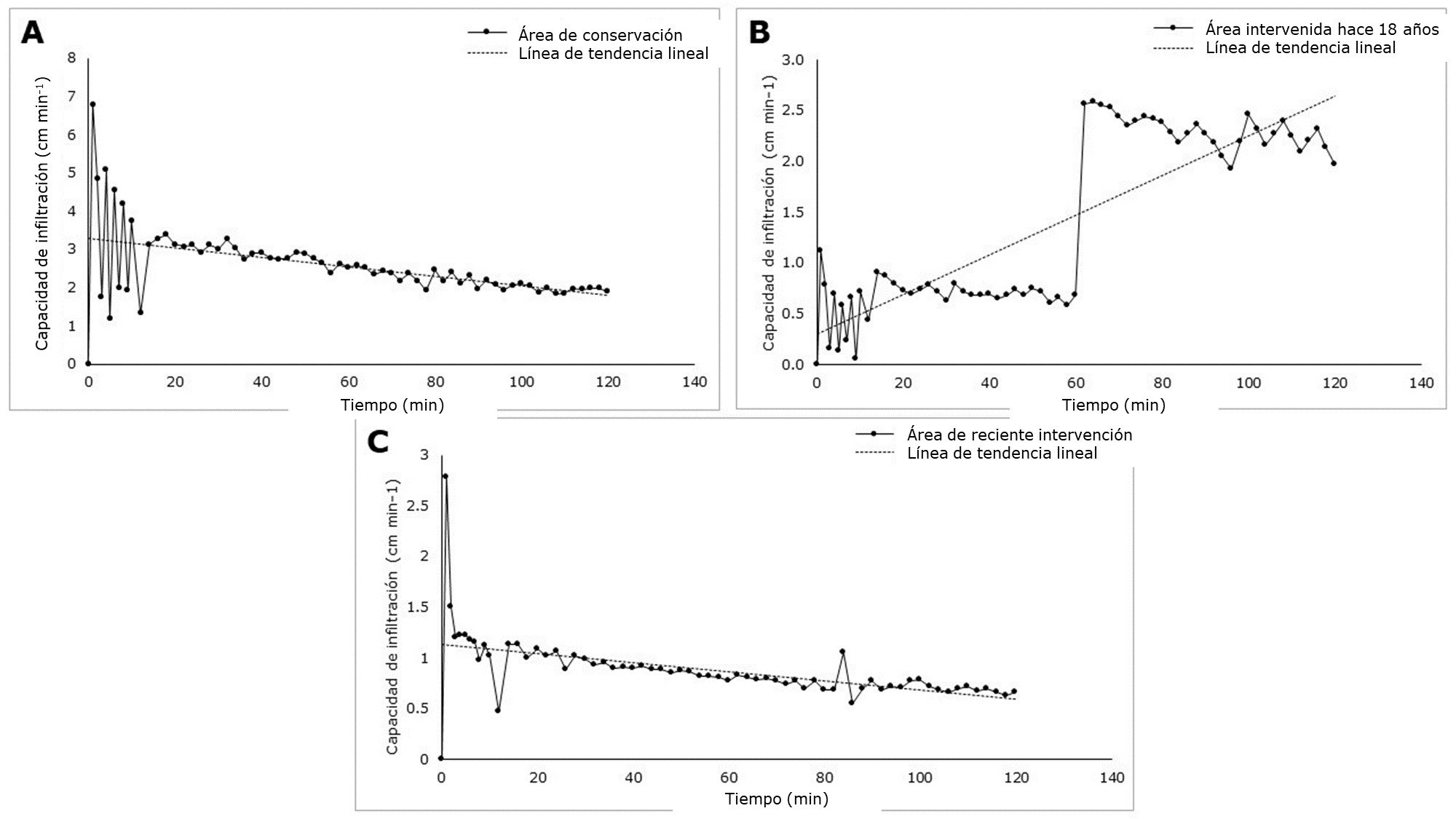 El análisis de la prueba de infiltración vertical del recurso hídrico en el suelo forestal indicó diferencias significativas (F=3.95, P≤0.0481) entre las áreas. La capacidad de infiltración del suelo en el área de conservación tuvo en promedio una tasa de 2.67 cm min-1. El área de reciente intervención registró el valor mínimo de movimiento vertical del agua con 0.04 cm min-1 (Cuadro 6). Cabe añadir que la capacidad de infiltración del suelo en el área de conservación tuvo valores entre 1.22 y 6.80 cm min-1 durante los primeros 12 minutos, en ese mismo tiempo las variaciones en las otras dos áreas fueron de 0.06 hasta 2.78 cm min-1. A partir del minuto 14, la capacidad de infiltración fue mayor en el área de conservación con tendencia a estabilizarse (1.84 a 3.03 cm min-1) a los 120 minutos. Sin embargo, para el área de reciente intervención, los valores de la capacidad de infiltración fueron menores en el mismo periodo (0.55 a 1.13 cm min-1). Por último, hay que resaltar que el área intervenida hace 18 años presentó menor capacidad de infiltración del minuto 14 al 58 (Figura 4B), pero experimentó un incremento notorio a partir del minuto 60, con valores similares (1.97 a 2.57 cm min-1) al área de conservación (Figura 4A).