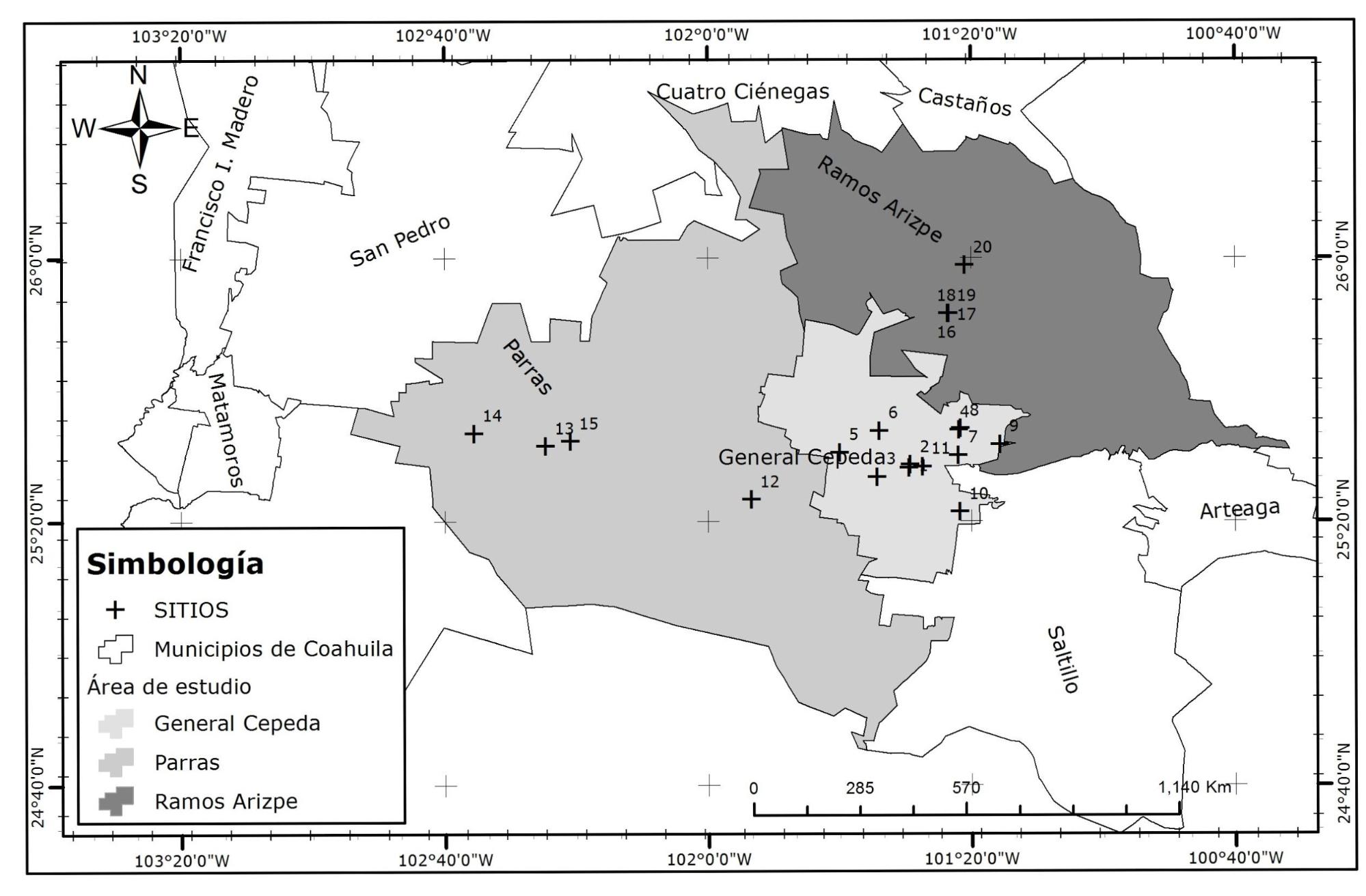 Figura 1. Distribución geográfica de las localidades de muestreo en los municipios General Cepeda, Parras de la Fuente y Ramos Arizpe, Coahuila.