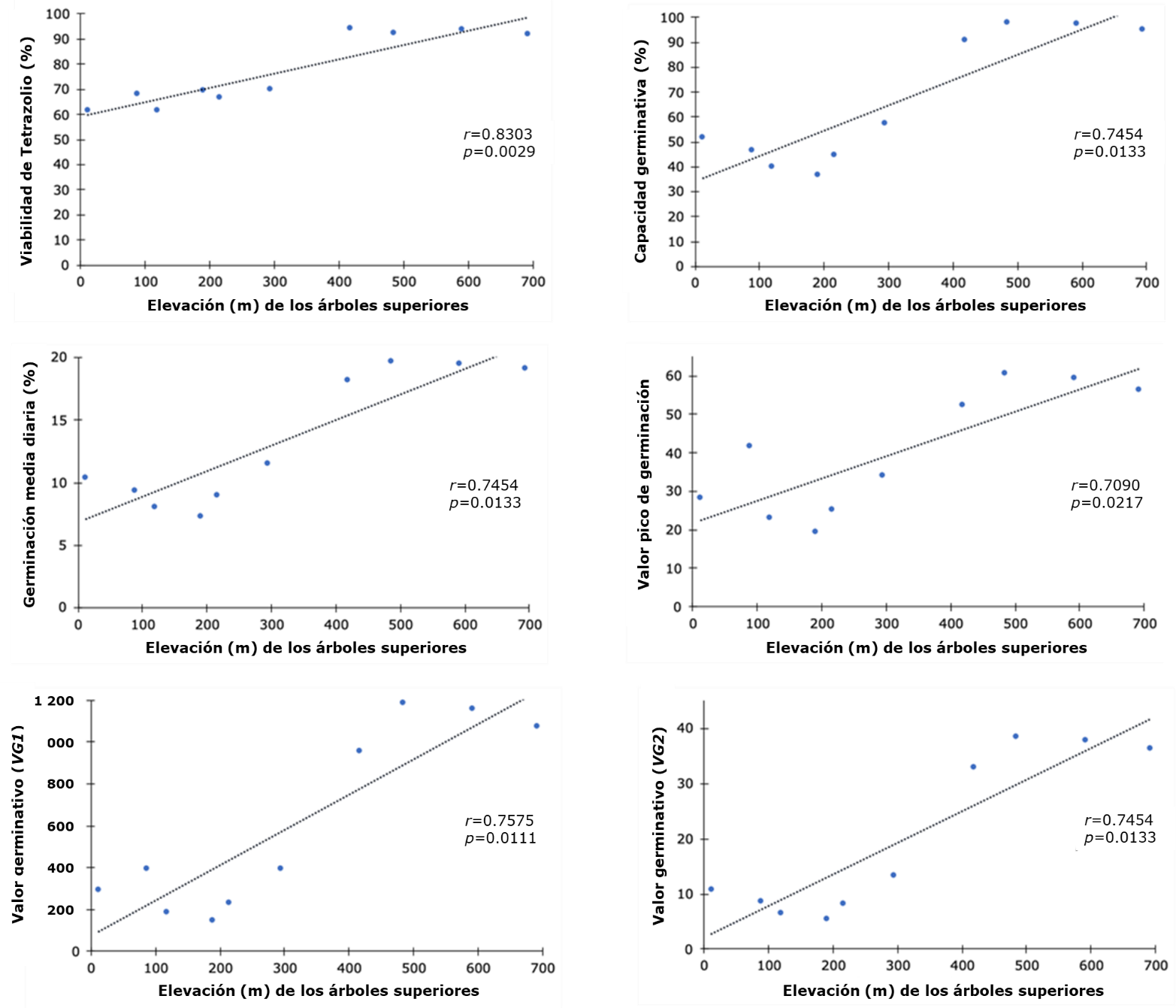 La germinación, viabilidad y los parámetros germinativos presentan una asociación positiva con la altitud, ya que las semillas recolectadas en altitudes superiores a 400 m tienen mejor calidad fisiológica y mayor capacidad germinativa.