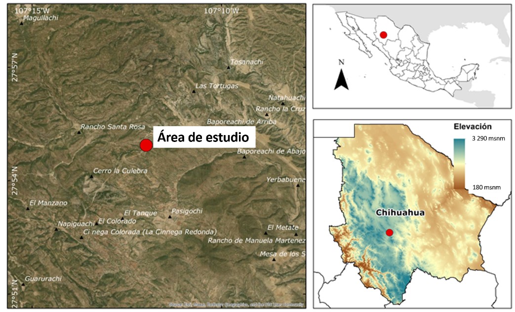 El área se localiza entre los 27°54'49" N y -107°12'45" O pertenecientes al ejido Pasigochi, municipio Carichí, estado de Chihuahua, México, donde se ubican rodales de P. cembroides en áreas sin manejo forestal (Figura 1). La altitud promedio del área es de 2 260 m, con un clima templado seco (Bsk) sensu Köppen, temperatura media anual de 18 °C, precipitación de 450 mm anuales; y dominancia de suelos del tipo Regosol (Comité Técnico Estatal de Sanidad Forestal del Estado de Chihuahua, 2022).