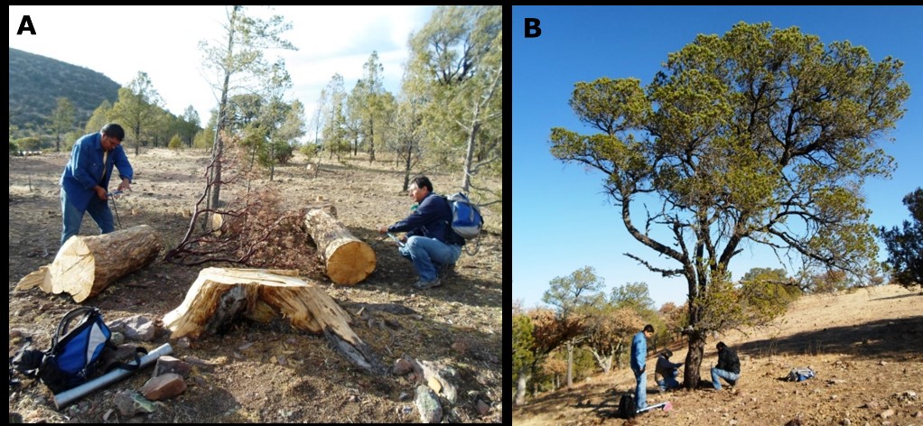 A = Obtención de núcleos de crecimiento de Pinus cembroides Zucc. afectados por Ips confusus Wood & Bright, 1992; B = Muestreo de árboles no atacados (testigos) cercanos a la zona afectada.