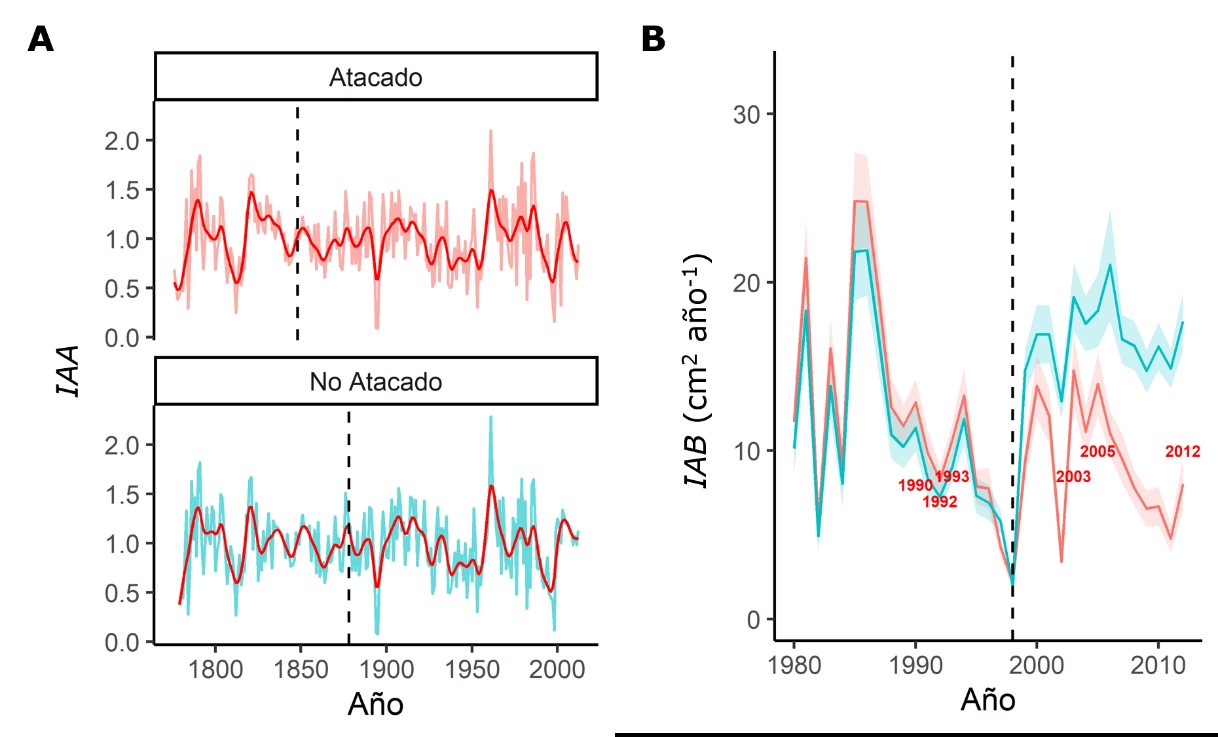 A = Índice de ancho de anillo (IAA); B = Incremento en área basal (IAB) de P. cembroides Zucc. donde las áreas sombreadas representan el error estándar. La línea roja en A es una curva suavizada a nivel década para resaltar periodos de baja frecuencia y la línea vertical discontinua de color oscuro indica un EPS>0.85. La línea vertical discontinua de color oscuro en B señala el año 1998, a partir del cual se observó un crecimiento diferenciado. En B se señalan los años con más de 1 000 ha afectadas por descortezadores en el estado de Chihuahua, de acuerdo con la Gerencia de Sanidad Forestal, Conafor (mediana=125 ha).