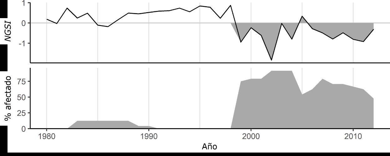 Para cuantificar el impacto de I. confusus sobre el crecimiento radial de P. cembroides se utilizó el análisis hospedero/no hospedero, el cual es de uso habitual en estudios dendroecológicos relacionados con plagas forestales (Swetnam et al., 1985; Lynch, 2012). Este análisis consiste en comparar las cronologías de la especie forestal atacada con respecto a la no atacada. De manera general, a la cronología de la especie afectada se le resta la cronología de la no afectada, una vez que comparten una varianza común, y así, cuantificar un índice residual también llamado Índice de Supresión de Crecimiento (GSI, por sus siglas en inglés) o su versión normalizada (NGSI). Cuando los periodos en que esta reducción (NGSI) superan un umbral crítico (-1.28 SD desviación estándar) durante varios años consecutivos, se consideran producto del ataque de insectos defoliadores o plagas (Girardin et al., 2001). Sin embargo, para que esos eventos se definan como ataques generalizados en todo el bosque, suele trabajarse con un umbral mínimo de impacto. En este estudio se estableció un umbral mínimo de afectación de 45 % del total de arbolado presente en al menos 10 árboles muestreados. El análisis de eventos de plaga se evaluó con la librería dfoliatR (Guiterman et al., 2020) en el programa R durante el periodo 1980-2012.