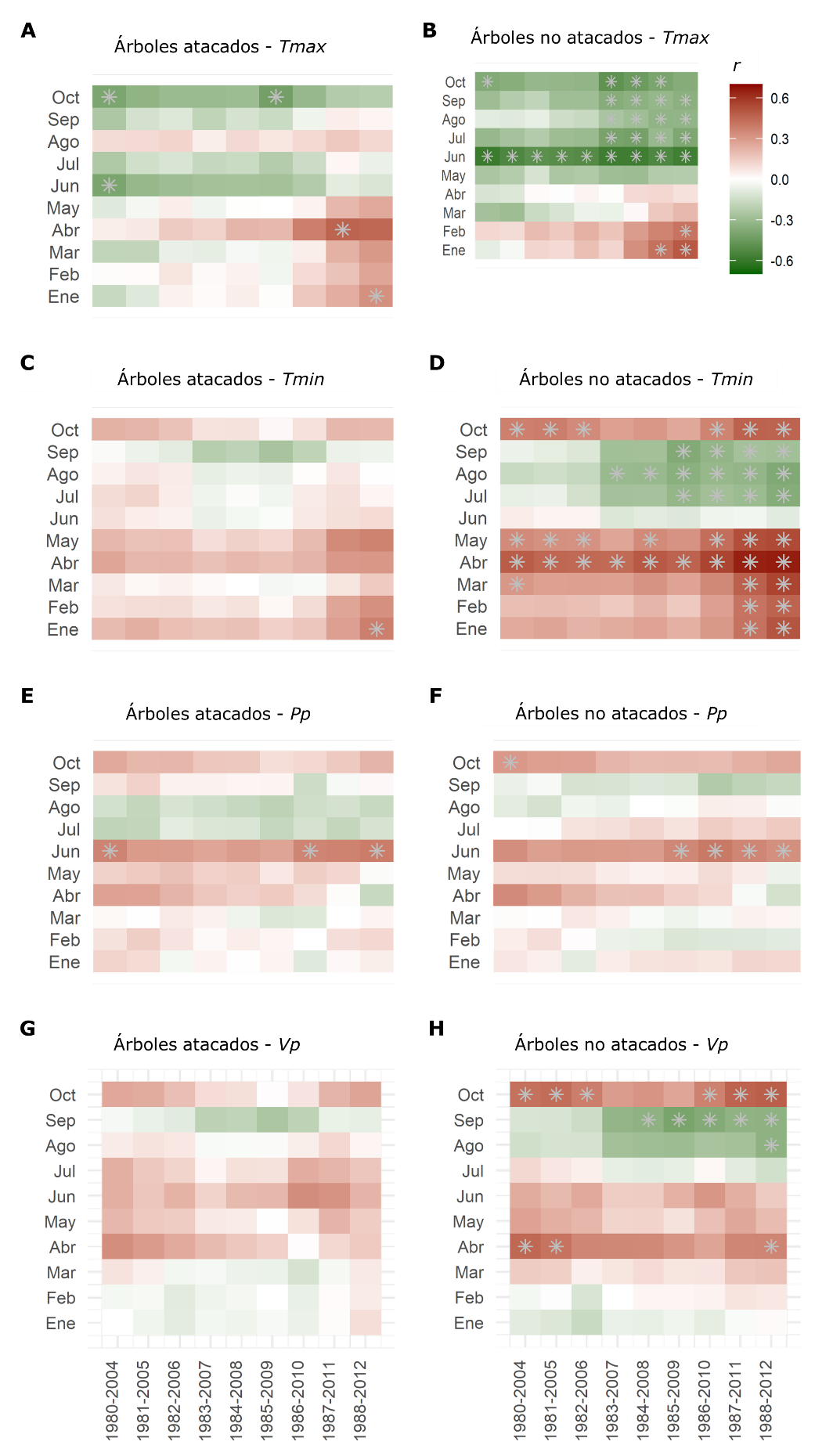 Tmax = Temperatura máxima; Tmin = Temperatura mínima; Pp = Precipitación; Vp = Presión de vapor de agua. *p<0.05.