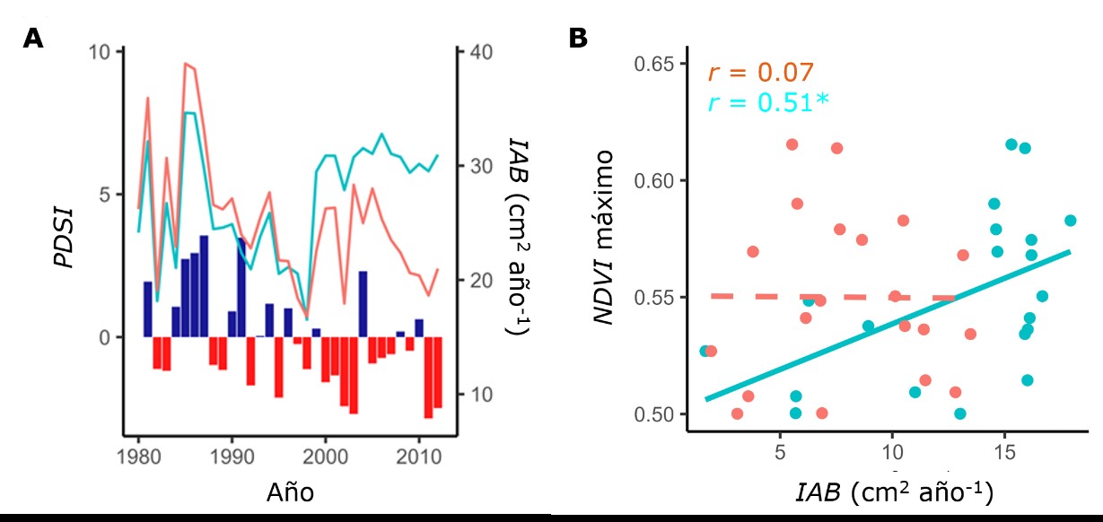 A = Influencia del Índice de Severidad de Sequia de Palmer (PDSIJJA) en el Incremento en Área Basal (IAB); B = Gráfico de dispersión entre Incremento en Área Basal (IAB) y NDVI máximo por año. Color rojo representa árboles atacados y color azul no atacados.