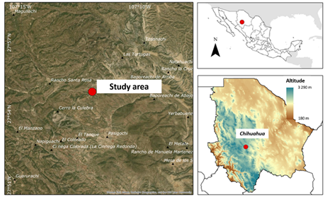 The area is located between 27°54'49" N and -107°12'45" W belonging to the Pasigochi ejido, Carichí municipality, state of Chihuahua, Mexico, where stands of P. cembroides are located in areas without forest management (Figure 1). The average altitude of the area is 2 260 m with a dry temperate climate (Bsk) sensu Köppen, average annual temperature of 18 °C, precipitation of 450 mm per year and dominance of Regosol type soils (Comité Técnico Estatal de Sanidad Forestal del Estado de Chihuahua, 2022).