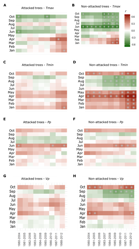 The characteristics that predispose forest species to bark beet attack are multiple, including structural attributes, ecological and climatic conditions (Müller et al., 2022). In general, ANA showed greater sensitivity to climatic variables than AA. For example, minimum temperature was positively correlated with IAA during March to May (r=0.36 to r=0.53, p<0.05) (Table 1). A negative association was observed with the maximum temperature from September to October prior to the growing year and with water vapor pressure (April), although exclusively for ANA (Table 1). No significant correlations were found between the IAA of the AA and the climatic variables analyzed.