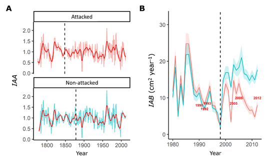 A = Ring width index (IAA); B = Basal Area Increment (IAB) of P. cembroides Zucc. where the shaded areas represent the standard error. The red line in A is a smoothed decade-level curve to highlight periods of low frequency and the dark dashed vertical line indicates an EPS>0.85. The dark dashed vertical line in B indicates the year 1998, from which differentiated growth was observed. In B the years with more than 1 000 hectares affected by bark beetles in the state of Chihuahua are indicated, according to the Forest Health Management, Conafor (median=125 ha).