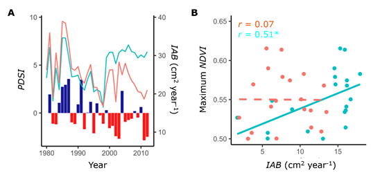 A = Influence of the Palmer Drought Severity Index (PDSIJJA) on the Increase in Basimetric Area (IAB); B = Scatter plot between Increase in Basimetric Area (IAB) and maximum NDVI per year. Red represents attacked trees and blue represents non-attacked trees.