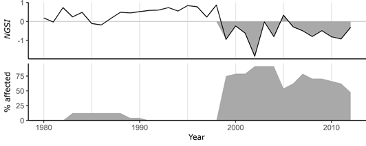 Normalized Growth Suppression Index (NGSI) with growth reduction events in gray (below zero). Values less than -1.28 are considered critical events. The lower panel shows the percentage of affected trees (n=24).