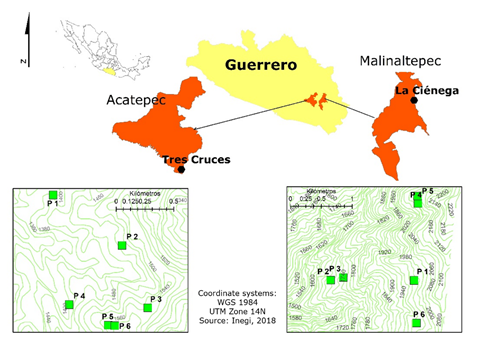 The study area included coffee plantations in the communities of La Ciénega (LC), belonging to the Malinaltepec municipality, and in Tres Cruces (TC), located in the Acatepec municipality (Figure 1). The climate in LC is temperate sub humid A(C)m, while in TC it is semi-warm sub humid (A)C(w1) (INEGI, 2008).
