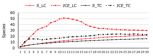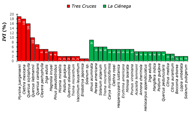 Notably, in the two studied communities, the species with the highest IVI were native (Alnus acuminata in LC and Myrsine juergensenii in TC), consistently with Moreno-Guerrero et al. (2020), who also cites species that are part of the original vegetation, such as Cedrela odorata L., Quercus crispifolia Trel., Tabebuia rosea (Bertol.) DC., and Guarea glabra Vahl. Likewise, Reyes et al. (2022) mention Inga micheliana Harms (synonym of Inga flexuosa Schltdl.), Tabebuia donnell-smithii Rose (synonym of Roseodendron donnell-smithii (Rose) Miranda), Cedrela odorata, and Tabebuia rosea as the species with the highest IVI. The presence of native species is due to their adaptation to the environmental characteristics; likewise, their permanence is also an indicator of the preference of the producers for these trees, since they generate additional benefits such as timber, fruit and flowers, and they fixate nitrogen, in addition to providing environmental services, among others (Sánchez et al., 2017).