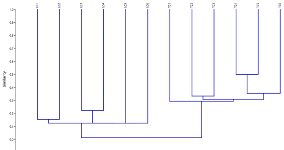 According to the Shannon-Wiener Index, the average diversity was 2.16 for LC and 2.25 for TC, values close to those recorded by Ramos et al. (2020) of 3.04, and by Silva-Aparicio et al. (2021) of 2.05. However, they are high in comparison with the values for the coffee growing areas of Soconusco estimated by Reyes et al. (2022) of 1.1, due to the tendency to the establishment of species of the Inga genus. As for the dominance (λ) per community (0.23 for LC and 0.14 for TC) and the effective number of species (abundant and very abundant, N1: LC=8.7, TC=9; N2: LC=4, TC=7), the values differ, as in relation to other works, such as the study by Silva-Aparicio et al. (2021), who report an average dominance of 0.14 and a number of species rated abundant (N1, 7.7) and very abundant (N2, 4.1). Variation in the richness and abundance of established species in each plot depends on both the environmental characteristics and the management (Manson et al., 2018). This last aspect could reflect a similar diversity (H') in the coffee plantations of the study communities, as the test of means did not exhibit significant differences; however, the environmental difference is evident in the composition of species.