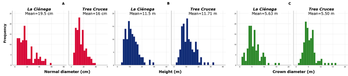 The average diameter of the species associated with coffee was 16.03 cm in TC and 19.53 cm in LC, which may be related to the composition, since in TC there were species that reach large diameters, such as Pinus pseudostrobus. Authors such as Sánchez-Clavijo et al. (2007) indicate an average diameter of 10 cm, and Silva-Aparicio et al. (2021) an average of 10.83 cm, which is related to the management; that is, the producer makes use of trees with larger diameters for the purpose of limiting the space to establish the largest number of coffee plants, in addition to monitoring the shade, as, according to Sánchez et al. (2017), it should be slight, with a continuous supply of easily degradable leaf litter (with a decomposition rate of k=0.415, depending on environmental conditions) (Munguía, 2007).