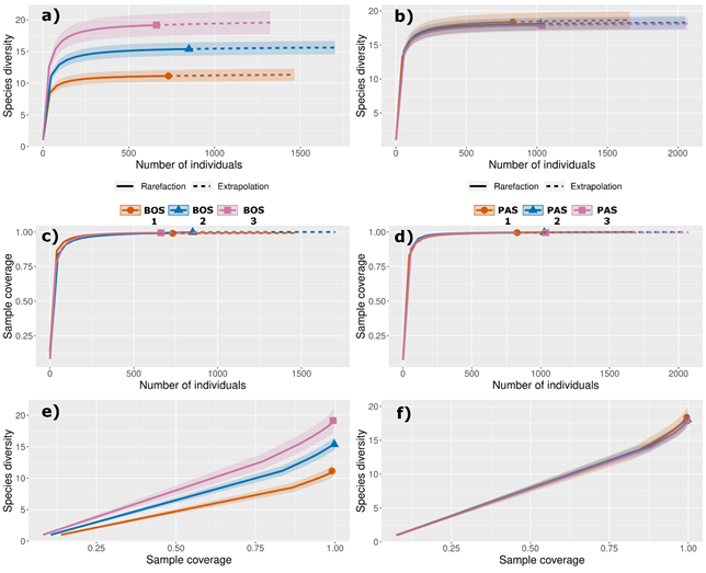 Sample robustness was measured with sample-size-based diversity accumulation curves, in which the expected Hill Shannon diversity is plotted as a function of sample size using the number of individuals (Chao et al., 2014; Cox et al., 2017). Coverage-based diversity curves were used as well to plot expected diversity as a function of interpolated (observed) and extrapolated (expected) coverage.