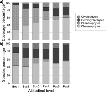 a = Dominant life forms per altitudinal level in forest (Bos1, Bos2, Bos3) and grassland (Pas4, Pas5, Pas6); b = Species belonging to different life forms in Pinus hartwegii Lind. treeline ecotone at Nevado de Toluca.