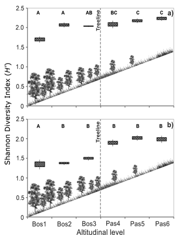 Figure 4. Shannon’s diversity index (H’) of plant life forms by altitudinal level, in forest (Bos1, Bos2, Bos3) and grassland (Pas4, Pas5, Pas6) covers at sampling sites.
