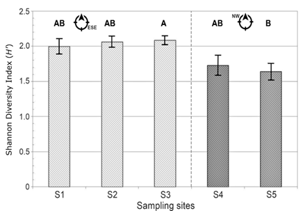 Highest diversity (H’=2.13) was recorded at altitudinal level Pas6 (4 096 m), while the lowest diversity (H’=1.5) was recorded at altitudinal level Bos1 (4 043 m; Figure 4). Shannon diversity index was positively related with increasing altitude at plots with a northwesterly aspect (F=15.22, P=0.0022) and at plots with an easterly-southeasterly exposure (F=8.47, P=0.0012; Figure 5). Diversity of sample sites also differed significantly (F=3.67, P=0.017); sites 1, 2, and 3, which had an easterly-southeasterly exposure, had greatest diversity (Figure 5).