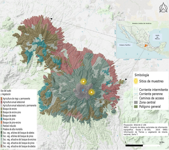 El área de estudio se localizó en el Estado de México, centro del país, entre los Valles de Toluca y Tenango, dentro del Área de Protección de Flora y Fauna Nevado de Toluca (18°51'-19°19' N y 99°38'-100°09' O; Figura 1); cuyo intervalo altitudinal es de 3 000 a 4 680 m (Vargas, 1984). Predominan los climas semifrío subhúmedo (C[E]wig) y el frío (E[T]Hwig) (García, 1990), con temperaturas medias inferiores a 10 °C, escasas precipitaciones y nevadas en invierno (Challenger y Soberón, 2008). El principal tipo de suelo es Andosol y en proporciones menores Feozem, Regosol, Cambisol y Litosol (Vargas, 1984). Los bosques templados de coníferas son abundantes y están dominados por especies de los géneros Abies Mill., Pinus L. y Quercus L. entre los 3 000 y 4 100 m; mientras que por arriba de 3 950 y hasta 4 500 m hay pastos de montaña, en los que predominan los géneros Festuca L. y Calamagrostis Adans. (Calderón de Rzedowski y Rzedowski, 2005).