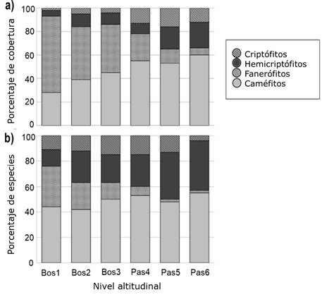 Las gramíneas en racimo tuvieron la mayor cobertura en el ecotono; Calamagrostis tolucensis (20-60 % de cobertura), Festuca tolucensis (10-30 %), Luzula racemosa Desv. (10-35 %), y Agrostis tolucensis (2-15 %) fueron las más dominantes en todas las parcelas. Los caméfitos fueron la forma de vida dominante en el ecotono arbóreo de Pinus hartwegii (56 % del total de especies registradas), seguidos por los hemicriptófitos (26 %), los fanerófitos (16 %) y los criptófitos (2 %). La cubierta de formas de vida cambió al aumentar la altitud, la cubierta de fanerófitos disminuyó en 91 %, mientras que la cubierta de caméfitos aumentó en 54 % (Figura 3a). Sin embargo, la proporción de la cubierta de fanerófitos se redujo en 94 % y la de caméfitos permaneció estable a lo largo del gradiente altitudinal (Figura 3b).