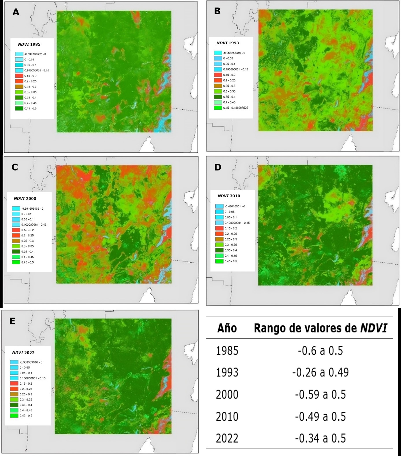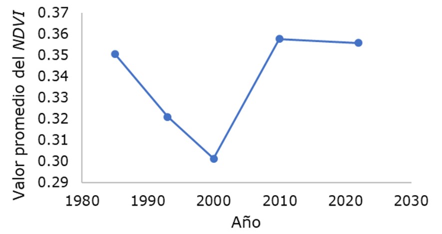 Los valores del NDVI variaron entre -0.59 y 0.5 de acuerdo con la categoría y el año de evaluación (Figura 2), así para 1985, 1993, 2000, 2010 y 2022, el valor más bajo (primera categoría) fue -0.58, -0.26, -0.59, -0.49 y -0.34, respectivamente. Los valores negativos representan escasa vegetación o vegetación menos vigorosa que aquellos sitios con valores positivos de NDVI: entre más cercanos a 1, la condición de la vegetación es más saludable.