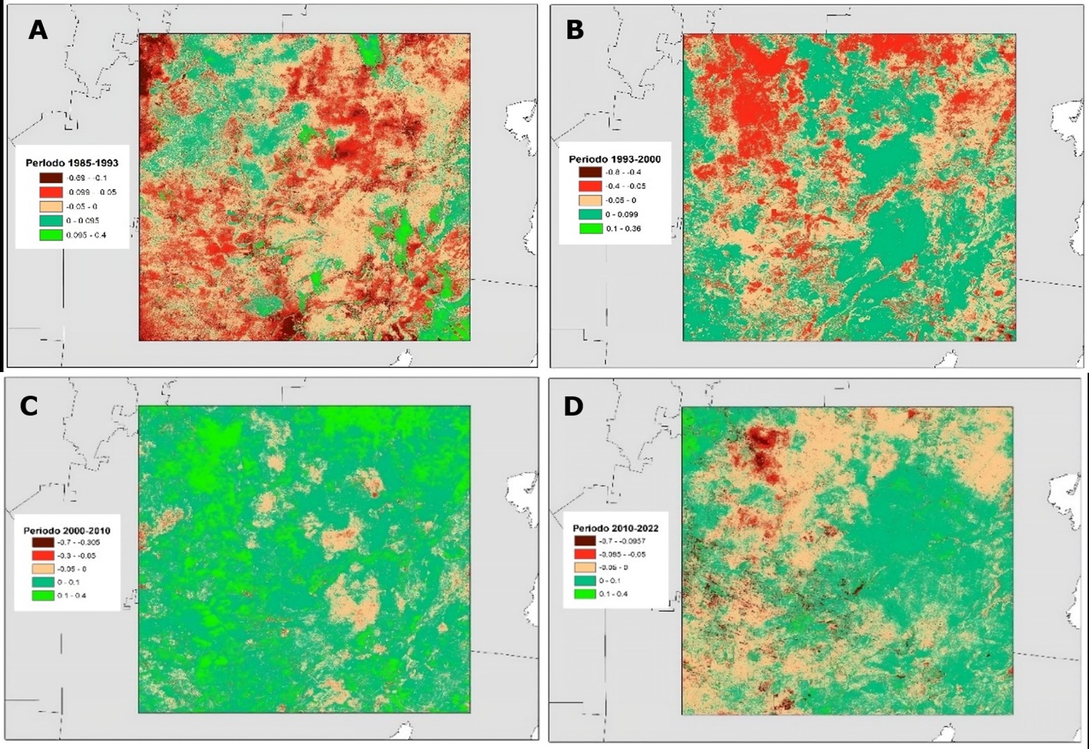 Para todos los años, el valor más alto fue de 0.5. Esto indica una diferencia significativa en el cambio de dichos valores, particularmente en los años de 1985 a 1993 (Figura 3A) y de 1993 a 2000 (Figura 3B). Esos datos se corroboran al hacer el análisis por periodos, en el cual se observó que para 1985 y 1993 hubo una disminución de 79.1 %, y de 1993 a 2000, los valores en el NDVI disminuyeron en 57.1 %, mientras que en el periodo de 2000 a 2010, los NDVI aumentaron en 83.7 %, lo que sugiere una recuperación de la vegetación y una mejor calidad de esta (Cuadro 2, Figura 4).