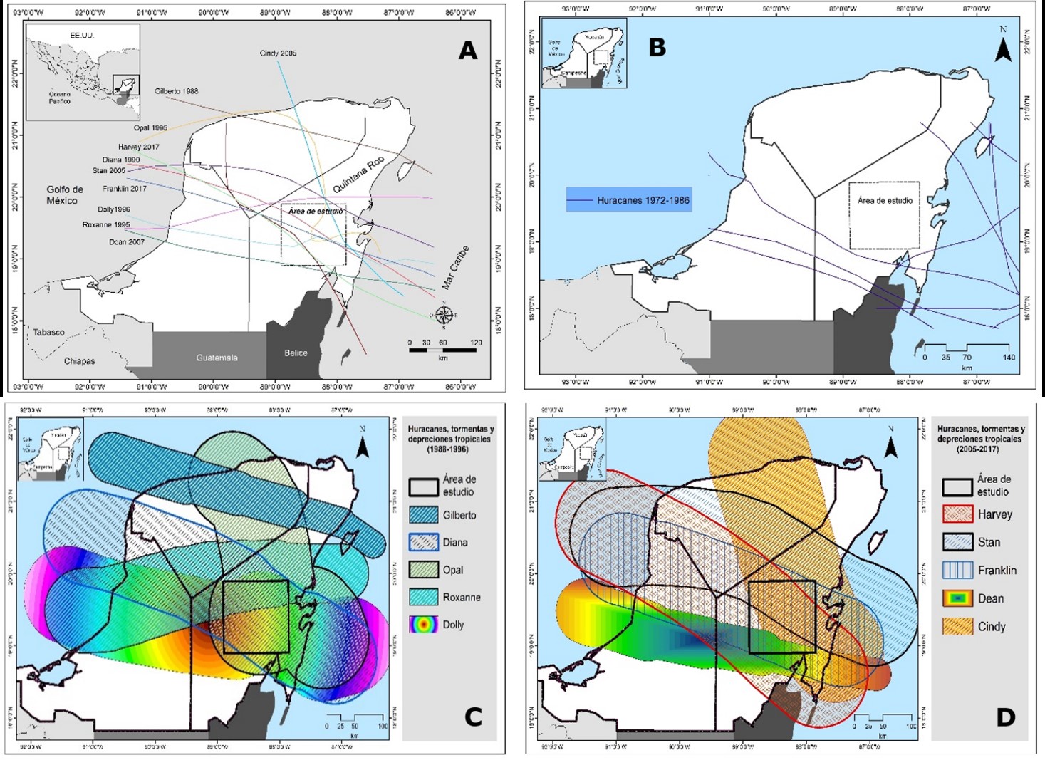 Con relación a los fenómenos meteorológicos, se ha documentado en la región su efecto sobre la selva dada su intensidad y área de influencia. Los resultados que aquí se presentan coinciden con los hallazgos de algunos autores, quienes concluyen que el impacto y amplitud de los huracanes, generalmente, se incrementa por la ocurrencia posterior de incendios forestales, como sucedió en los casos de Gilberto, Ópalo, Roxanne y Dean (Navarro y Granados, 1997; Navarro-Martínez et al., 2012). Para la Península de Yucatán, Snook (1993) y Vester y Navarro (2007) concluyen que los huracanes crean condiciones favorables para la regeneración de la selva, ya que las hacen altamente resilientes tanto a su presencia como al fuego. Además, dichos factores determinan la dinámica de estos ecosistemas (Vester y Navarro, 2007).