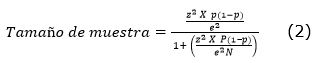 Para obtener una tendencia en los valores del NDVI por periodo de tiempo, se dividió el área en parcelas de una hectárea, es decir 1 200 000 parcelas. Se consideró como el tamaño total de la muestra la superficie del área de estudio, y se eligieron 385 parcelas al azar de las que se estimaron los valores del NDVI. El tamaño de muestra se definió buscando una confiabilidad de 95 %, con base en la fórmula siguiente (Daniel, 1991):