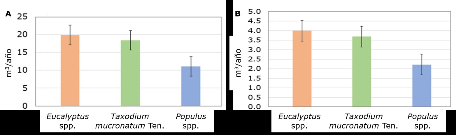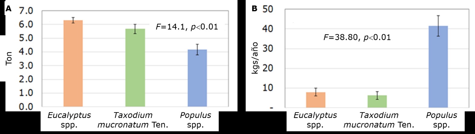 En cuanto al secuestro anual de CO2, como se muestra en la Figura 2B, en valores promedio por árbol, el género Populus es el que más contribuyó a la eliminación del dióxido de carbono del ambiente (41.43 kg año-1) seguido de Eucalyptus (7.98 kg año-1) y Taxodium mucronatum (6.27 kg año-1).