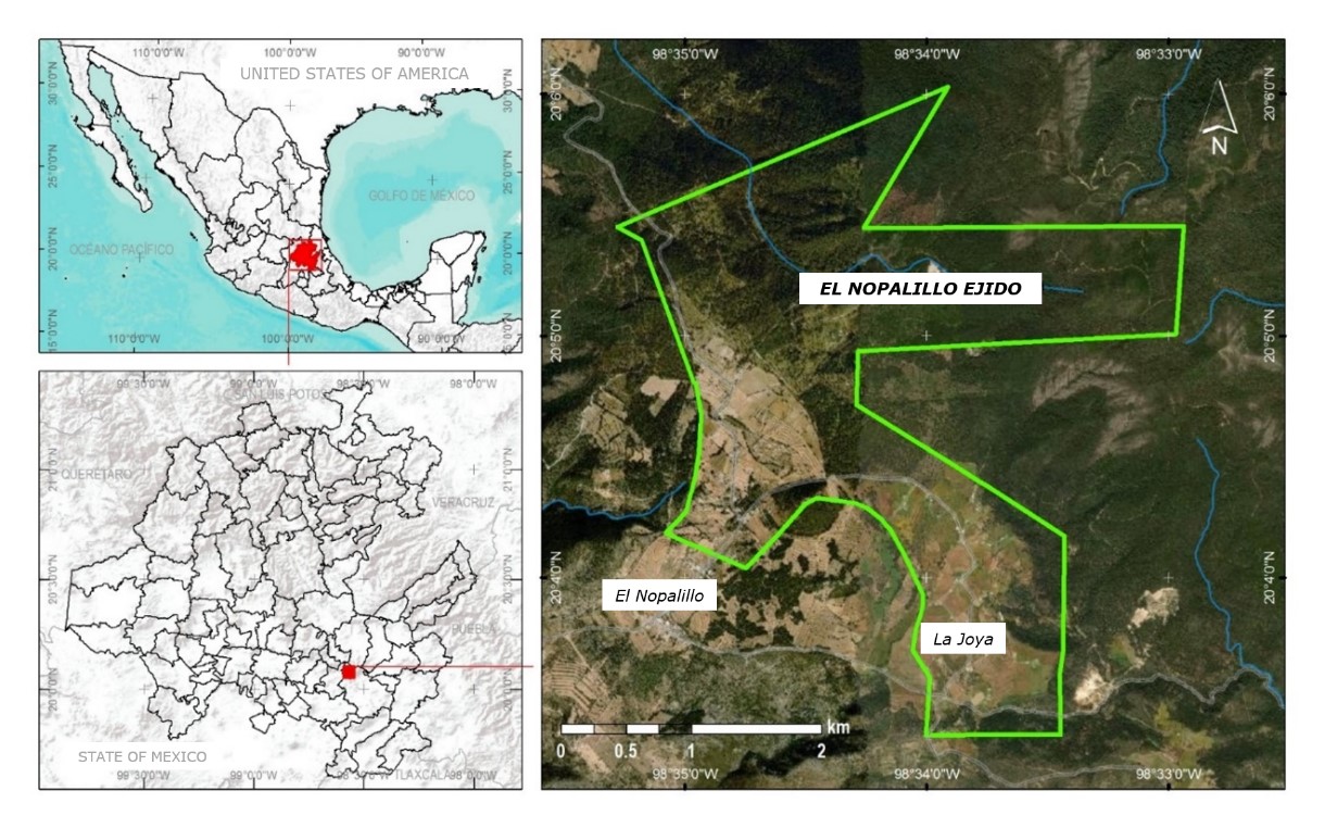 Figure 1. Location of the ecological integrity study area in forests under forest management in the ejido El Nopalillo, in Hidalgo, Mexico.