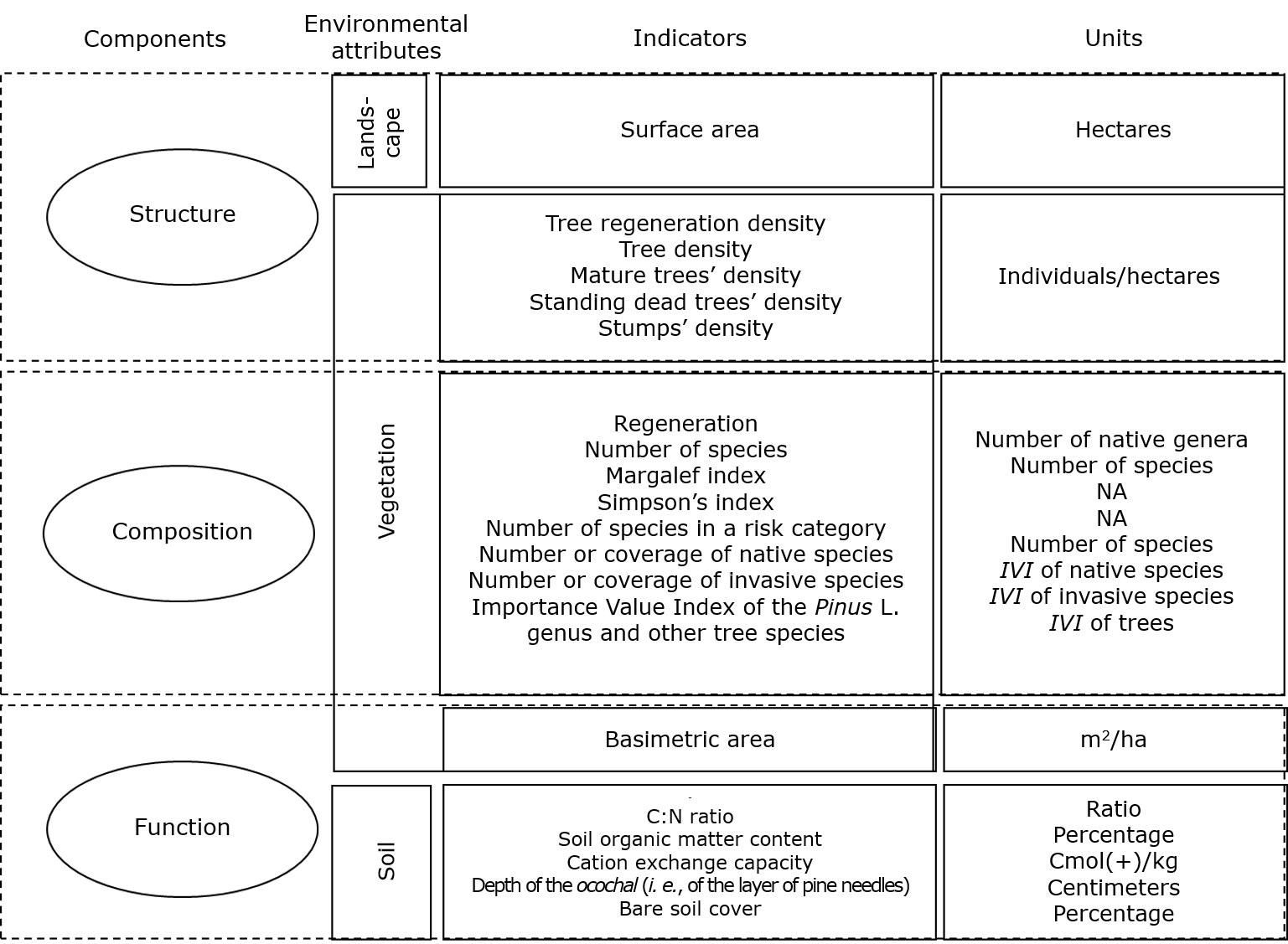 A conceptual ecological model was developed (Figure 2), wherein the landscape, vegetation, and soil as the three ecological attributes that play the most important role in maintaining the EI of the ecosystem (Schroeder et al., 2011). These attributes are characterized by 20 indicators (Table 2) which are related to the structure (site occupancy level based on the tree density in the evaluated area), composition (species taxonomy and the ecological indicators of plant species), and function (soil and basal area properties as indicators of carbon sequestration capacity) of the ecosystem.