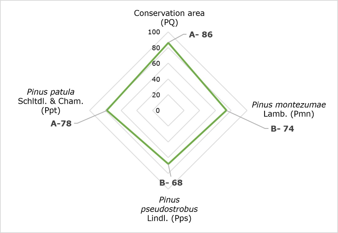 The lowest EII value was obtained by the association of P. pseudostrobus (Pps) with 68 points and a good category (Figure 3), the level of integrity is considered acceptable, although minimal human intervention is required to maintain or enhance it. There is a moderate impact on structure and composition, and although the ecosystem function is not compromised, monitoring is necessary to ensure its continuity or improvement. The indicators contributing to the lowest values were species at risk, density of mature trees, standing dead trees, and stump density. In the same category, with 74 points, was the association of P. montezumae (Pmn) (Figure 3), and the attributes with the lowest score were the same those for Pps, except for stump density (Table 2, Table 3).
