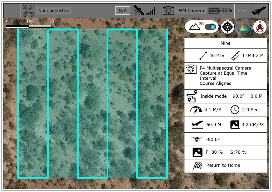 The occurrence of mixed species in natural forest stands represents ideal laboratories in which to test the variability of NDVI at tree level. The diversity of species under management in these plots is ideal for conducting such studies. In addition, drones present great versatility for configuring missions according to users' interests. For example, when access to sites of interest or the weather conditions limit image acquisition at the desired time, the user can execute the missions when conditions permit, simply adjusting the model parameters to the respective time.